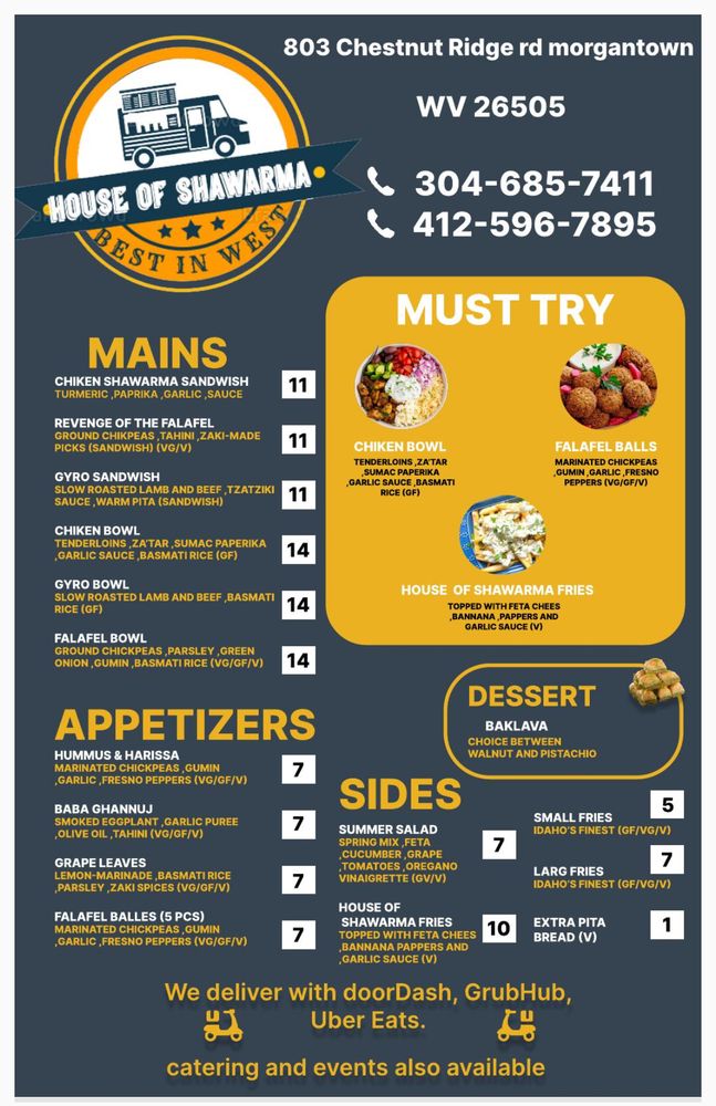 Welcome to House of Shawarma, a gem located at 803 Chestnut Ridge Rd, Morgantown, WV, offering a vibrant Mediterranean experience. This food truck invites you to indulge in authentic flavors with a diverse menu that caters to all diets, including vegetarian and vegan options.